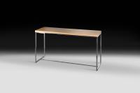 Consolle rettangolare con piano in legno di rovere spazzolato e gambe in acciaio.