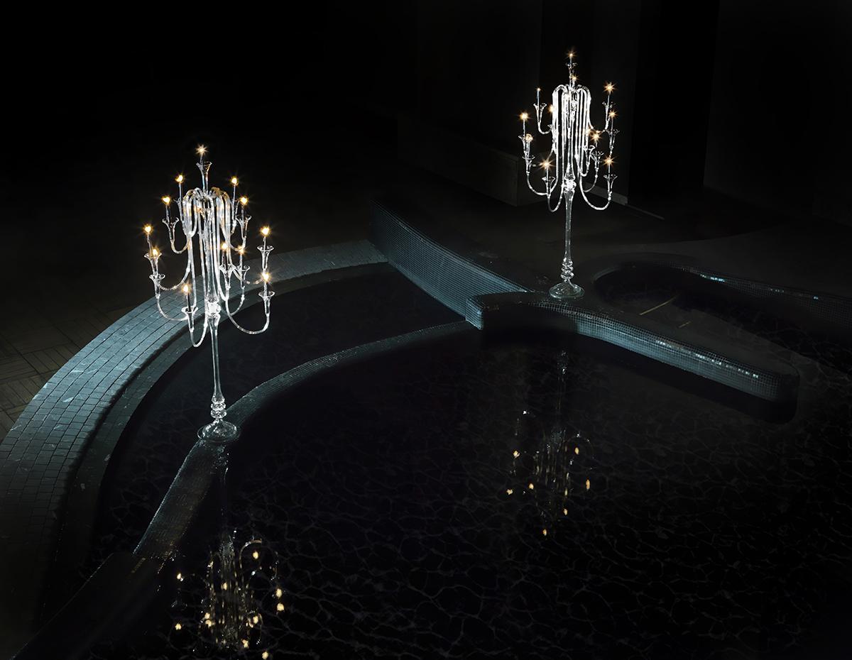 Candelabro in pirex, ideale per la decorazione di interni di ristoranti, allestimento matrimoni ed eventi, home decor.