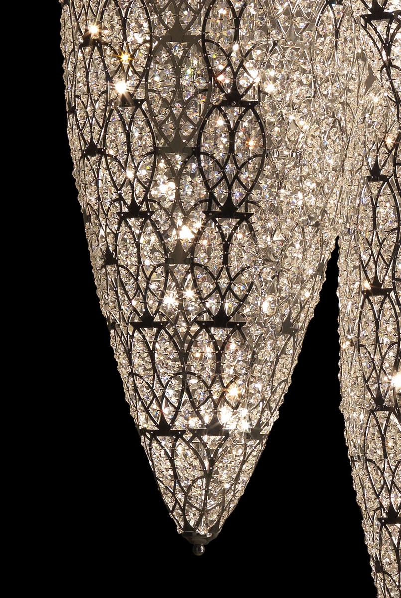Lampadario extra large composto da lampade a sospensione Arabesque Sensation con struttura a maglie d'acciaio saldate tra loro e cristalli sfaccettati fissati manualmente.